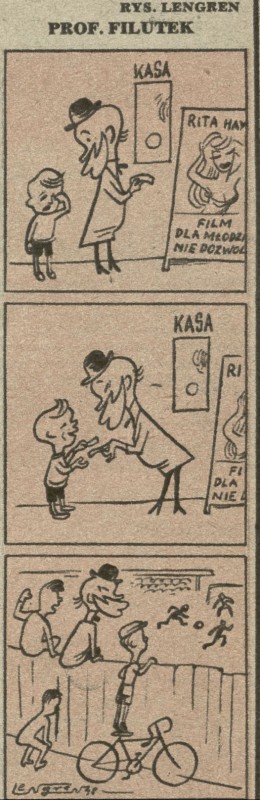 Archiwum / Profesor Filutek nr 157 (15/1948) 36/43 Podziel się Tytuł Prof. Filutek Autor Zbigniew Lengren Rubryka Profesor Filutek Artykuł z numeru 157 (15/1948) Data wydania 11 kwietnia 1948 Tagi żart rysunkowy Rita Hayworth kino piłka nożna mecz