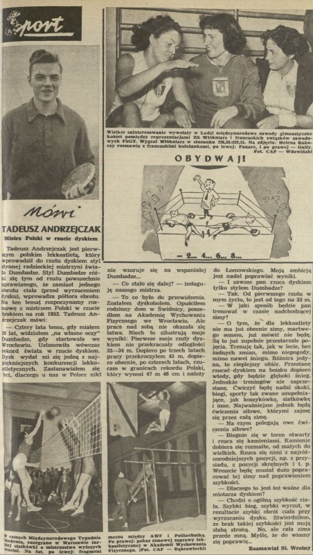 Archiwum / Sport nr 399 (48/1952) 519/1805 Podziel się Tytuł Mówi Tadeusz Andrzejczak - Mistrz Polski w rzucie dyskiem Autor Stanisław Wrotny Rubryka Sport Artykuł z numeru 399 (48/1952) Data wydania 30 listopada 1952