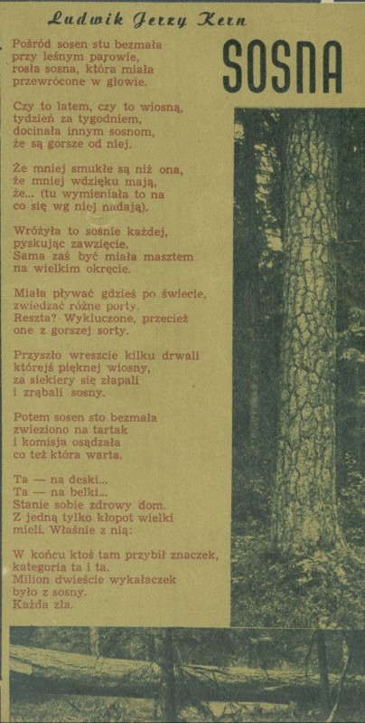 Archiwum / Poezja nr 444 (41/1953) 14/58 Podziel się Tytuł Sosna Autor Ludwik Jerzy Kern Kategoria Poezja Artykuł z numeru 444 (41/1953) Data wydania 11 października 1953 Tagi las