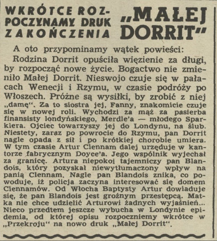 Archiwum / Różności nr 447 (44/1953) 14/15 Podziel się Tytuł Wkrótce rozpoczynamy druk zakończenia „Małej Dorrit” Kategoria Różności Artykuł z numeru 447 (44/1953) Data wydania 1 listopada 1953 Tagi fragmenty powieści Mikulski Dickens Komarnicka