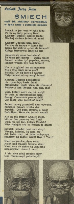 Archiwum / Rozmaitości [old] nr 593 (34/1956) 23039/123969 Podziel się Tytuł Śmiech czyli jak niektórzy wprowadzają w życie hasło o potrzebie humoru Autor Ludwik Jerzy Kern Rubryka Rozmaitości [old] Artykuł z numeru 593 (34/1956) Data wydania 19 sierpnia 1956