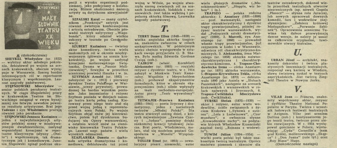 Archiwum / Mały słownik teatru XX wieku nr 593 (34/1956) 53/185 Podziel się Tytuł Mały słownik teatru XX wieku – S, T, U, V Autor Juliusz Kydryński Rubryka Mały słownik teatru XX wieku Artykuł z numeru 593 (34/1956) Data wydania 19 sierpnia 1956 Tagi TEATR Seybal Szaflarska Szubert Szpalski Tetmajer Tuwim Vilar