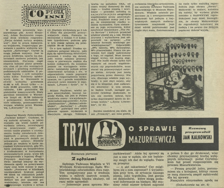 Archiwum / Co piszą inni nr 591 (32/1956) 24/1282 Podziel się Tytuł Co piszą inni Rubryka Co piszą inni Artykuł z numeru 591 (32/1956) Data wydania 5 sierpnia 1956 Tagi rocznica powstania warszawskiego Wanda Falkowska "Czyściec kobiet" Faulkner Makowski