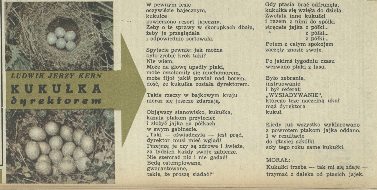 Archiwum / Rozmaitości [old] nr 447 (44/1953) 138/459 Podziel się Tytuł Kukułka dyrektorem Autor Ludwik Jerzy Kern Rubryka Rozmaitości [old] Artykuł z numeru 447 (44/1953) Data wydania 1 listopada 1953