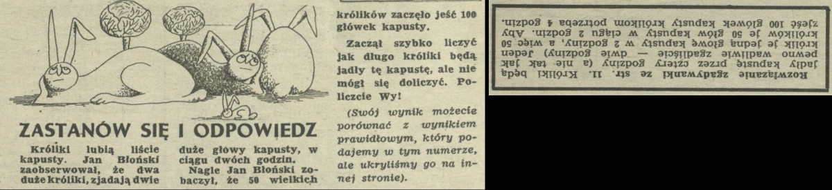Archiwum / Zastanów się nr 591 (32/1956) 187/269 Podziel się Tytuł Zastanów się i odpowiedz Rubryka Zastanów się Artykuł z numeru 591 (32/1956) Data wydania 5 sierpnia 1956 Tagi zagadka zgadywanka królik kapusta