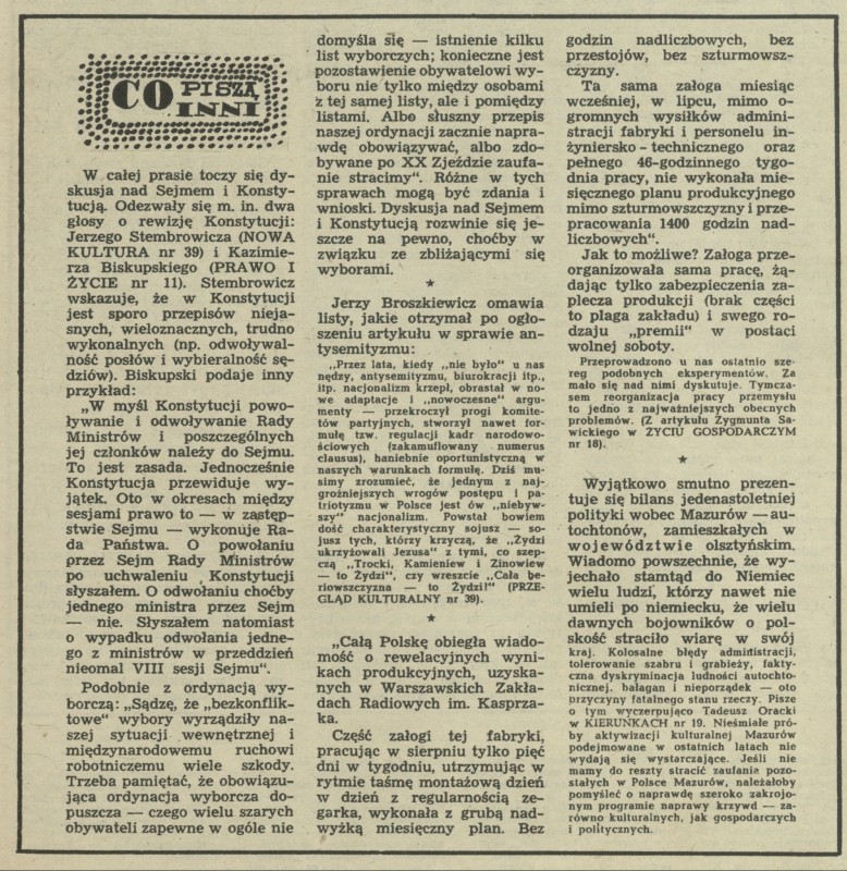 Archiwum / Co piszą inni nr 599 (40/1956) 10/17 Podziel się Tytuł Co piszą inni Rubryka Co piszą inni Artykuł z numeru 599 (40/1956) Data wydania 30 września 1956 Tagi Sejm konstytucja