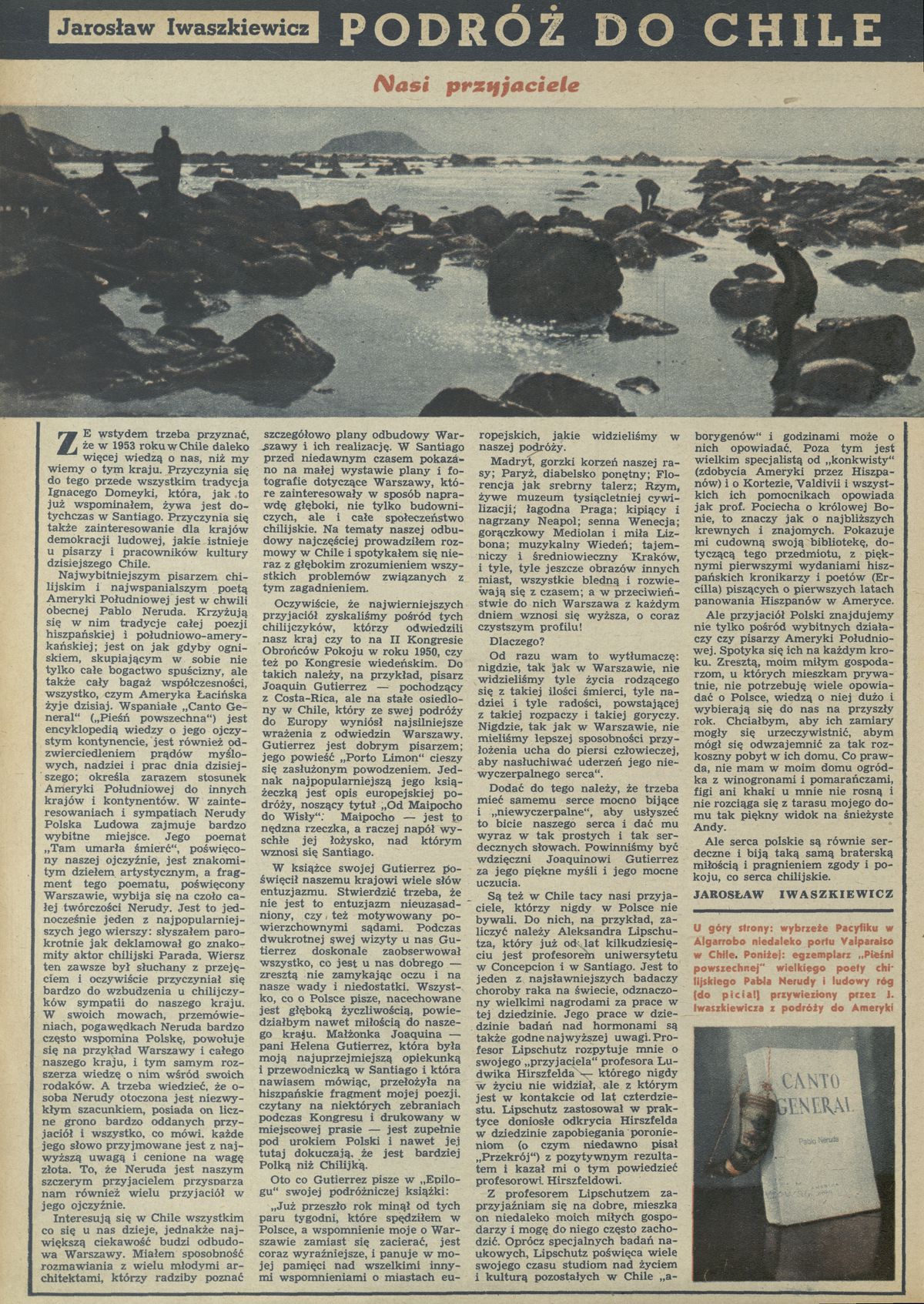 Archiwum / Reportaż nr 427 (24/1953) 2/2 Podziel się Tytuł Podróż po Chile. Nasi przyjaciele Autor Jarosław Iwaszkiewicz Kategoria Reportaż Artykuł z numeru 427 (24/1953) Data wydania 14 czerwca 1953
