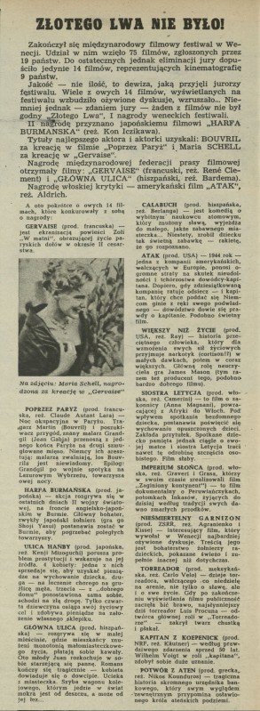 Archiwum / Film nr 600 (41/1956) 1/1 Podziel się Tytuł Złotego Lwa nie było! Rubryka Film Artykuł z numeru 600 (41/1956) Data wydania 7 października 1956 Tagi festiwal wenecki Festiwal Filmowy kinematografia