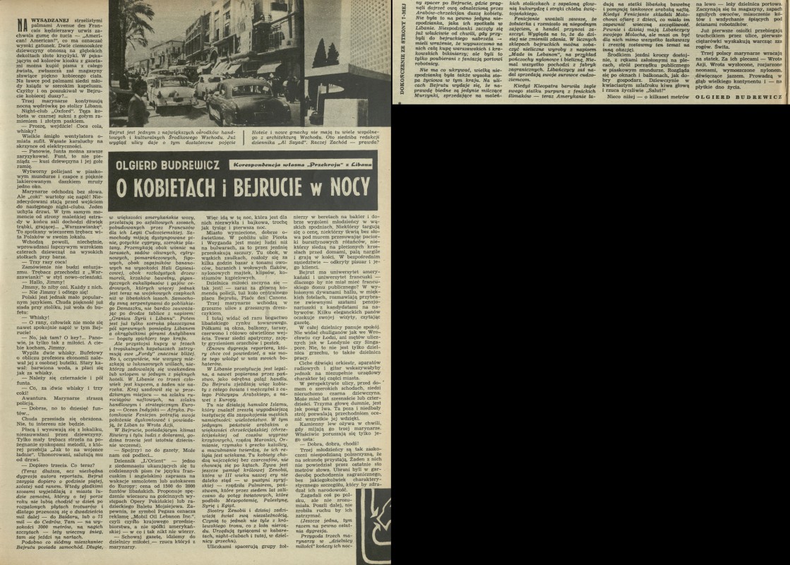Archiwum / korespondencja własna "Przekroju" nr 600 (41/1956) 151/297 Podziel się Tytuł O kobietach i Bejrucie w nocy Autor Olgierd Budrewicz Rubryka korespondencja własna "Przekroju" Artykuł z numeru 600 (41/1956) Data wydania 7 października 1956 Tagi Liban kraj arabski