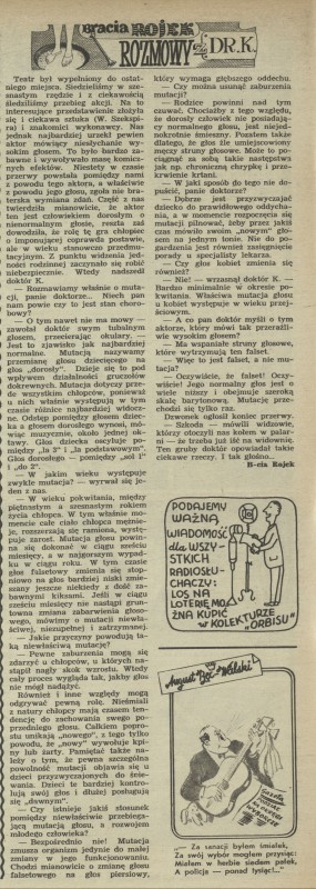 Archiwum / Felieton nr 389 (38/1952) 166/173 Podziel się Tytuł Rozmowy z Dr. K. Autor Bracia Rojek Kategoria Felieton Artykuł z numeru 389 (38/1952) Data wydania 21 września 1952 Tagi mutacja głosu dojrzewane zdrowie