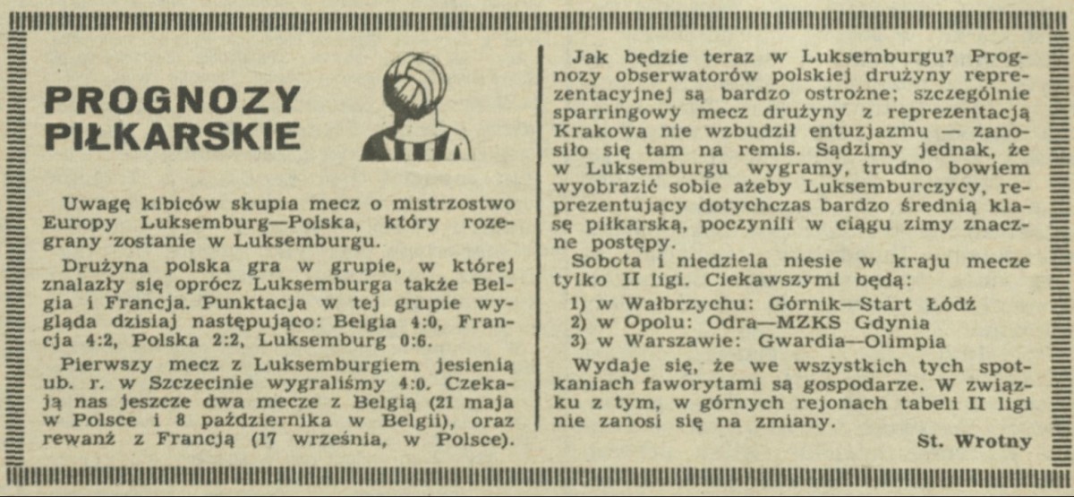 Archiwum / Piłkarskie prognozy nr 1149 (16/1967) 47984/123969 Podziel się Tytuł Prognozy piłkarskie Autor Stanisław Wrotny Rubryka Piłkarskie prognozy Artykuł z numeru 1149 (16/1967) Data wydania 16 kwietnia 1967 Tagi mecz z Luksemburgiem