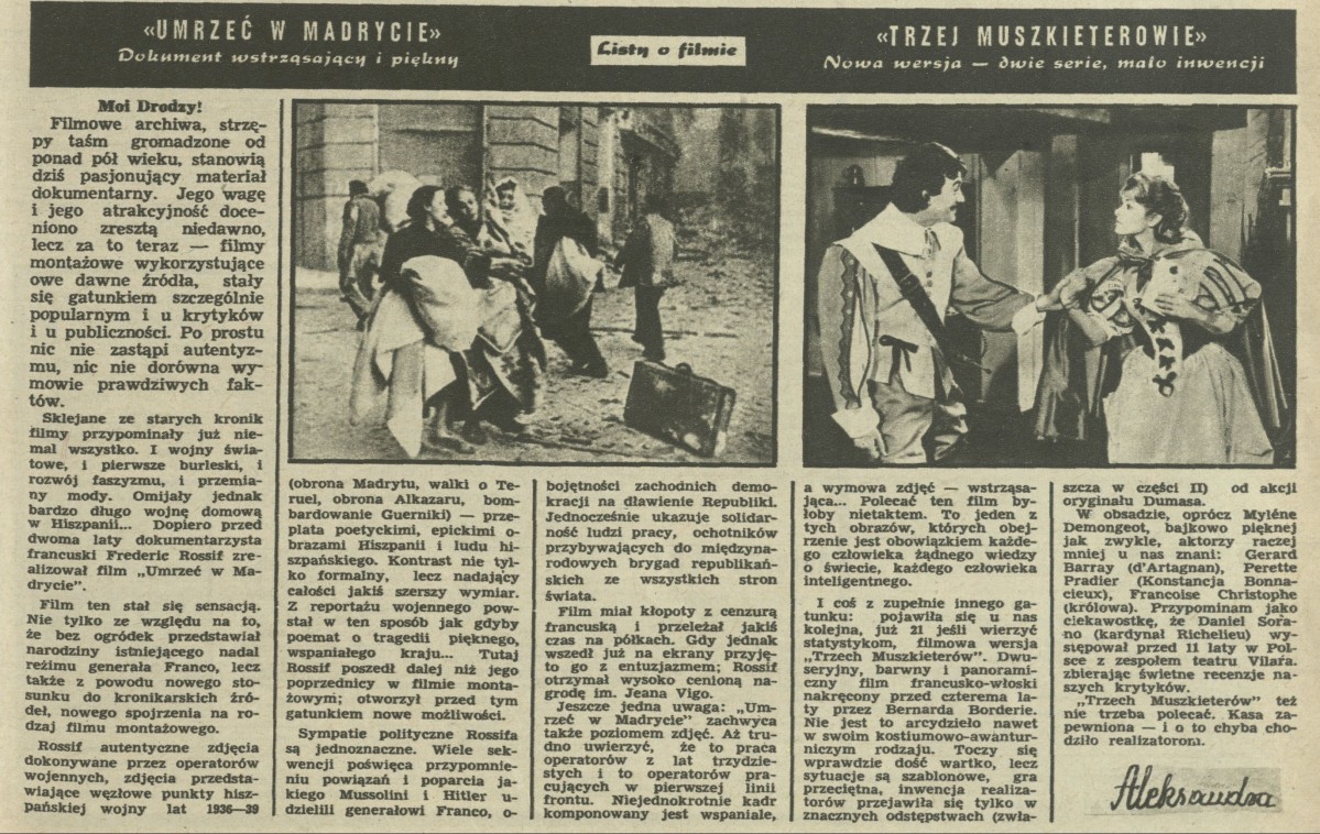 Archiwum / Listy o filmie nr 1065 (36/1965) 1/1 Podziel się Tytuł Listy o filmie Autor Aleksandra Rubryka Listy o filmie Artykuł z numeru 1065 (36/1965) Data wydania 5 września 1965 Tagi "Umrzeć w Madrycie" "Trzej muszkieterowie"