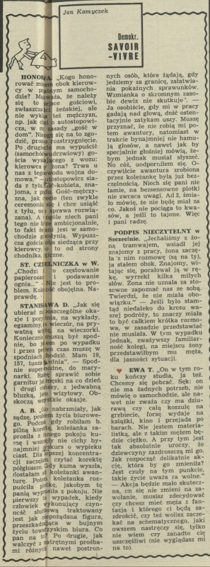 Archiwum / Demokratyczny savoir-vivre nr 1149 (16/1967) 09/30 Podziel się Tytuł Demokratyczny Savoir-vivre Autor Jan Kamyczek Rubryka Demokratyczny savoir-vivre Artykuł z numeru 1149 (16/1967) Data wydania 16 kwietnia 1967