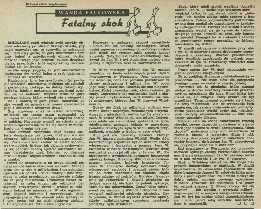 Archiwum / Kronika sądowa nr 1065 (36/1965) 44677/123969 Podziel się Tytuł Fatalny skok Autor Wanda Falkowska Rubryka Kronika sądowa Artykuł z numeru 1065 (36/1965) Data wydania 5 września 1965