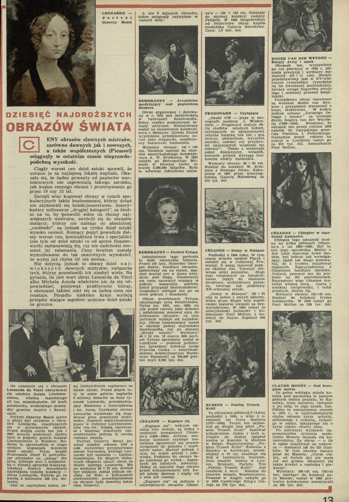 Archiwum / Fotoreportaż nr 1149 (16/1967) 48003/123969 Podziel się Tytuł Dziesięć najdroższych obrazów świata Kategoria Fotoreportaż Artykuł z numeru 1149 (16/1967) Data wydania 16 kwietnia 1967