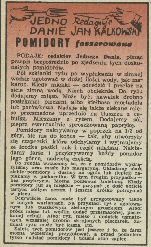 Archiwum / Jedno danie nr 1065 (36/1965) 04/10 Podziel się Tytuł Pomidory faszerowane Autor Jan Kalkowski Rubryka Jedno danie Artykuł z numeru 1065 (36/1965) Data wydania 5 września 1965 Tagi gastronomia kulinaria przepis kulinarny pomidory farsz