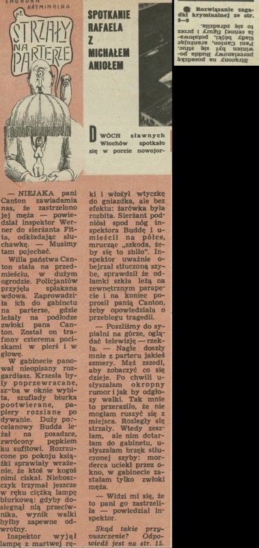 Archiwum / Zagadka kryminalna nr 1065 (36/1965) 11/24 Podziel się Tytuł Strzały na parterze Rubryka Zagadka kryminalna Artykuł z numeru 1065 (36/1965) Data wydania 5 września 1965