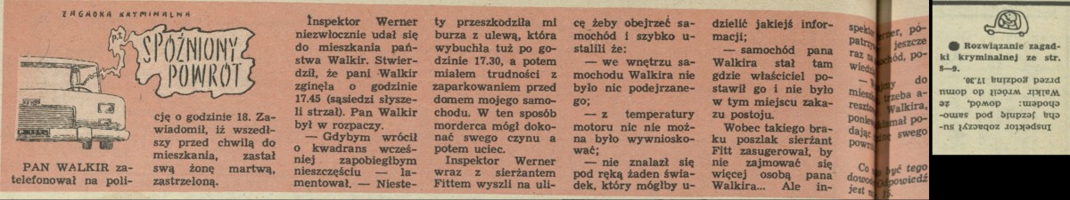 Archiwum / Zagadka kryminalna nr 1094 (13/1966) 45831/123969 Podziel się Tytuł Spóźniony powrót Rubryka Zagadka kryminalna Artykuł z numeru 1094 (13/1966) Data wydania 27 marca 1966