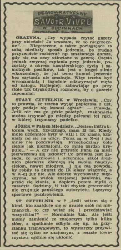Archiwum / Demokratyczny savoir-vivre nr 485 (30/1954) 29/51 Podziel się Tytuł Demokratyczny savoir-vivre Autor Jan Kamyczek Rubryka Demokratyczny savoir-vivre Artykuł z numeru 485 (30/1954) Data wydania 25 lipca 1954