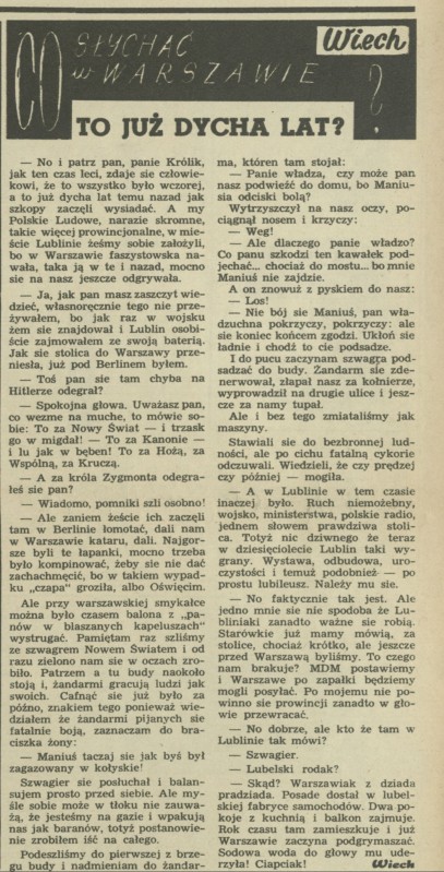 Archiwum / Felieton nr 485 (30/1954) 273/512 Podziel się Tytuł Co słychać w Warszawie? To już dycha lat? Autor Wiech Kategoria Felieton Artykuł z numeru 485 (30/1954) Data wydania 25 lipca 1954