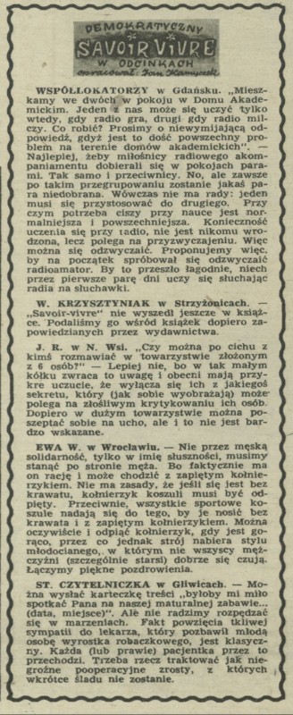 Archiwum / Demokratyczny savoir-vivre nr 482 (27/1954) 26/51 Podziel się Tytuł Demokratyczny savoir-vivre Autor Jan Kamyczek Rubryka Demokratyczny savoir-vivre Artykuł z numeru 482 (27/1954) Data wydania 4 lipca 1954 Tagi obyczaje kultura