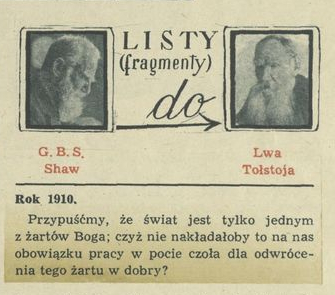 Archiwum / Listy sławnych ludzi nr 1319 (29/1970) 1/1 Podziel się Tytuł Listy (fragmenty) George Bernard Shaw do Lwa Tołstoja Autor Bernard Shaw George Rubryka Listy sławnych ludzi Artykuł z numeru 1319 (29/1970) Data wydania 19 lipca 1970