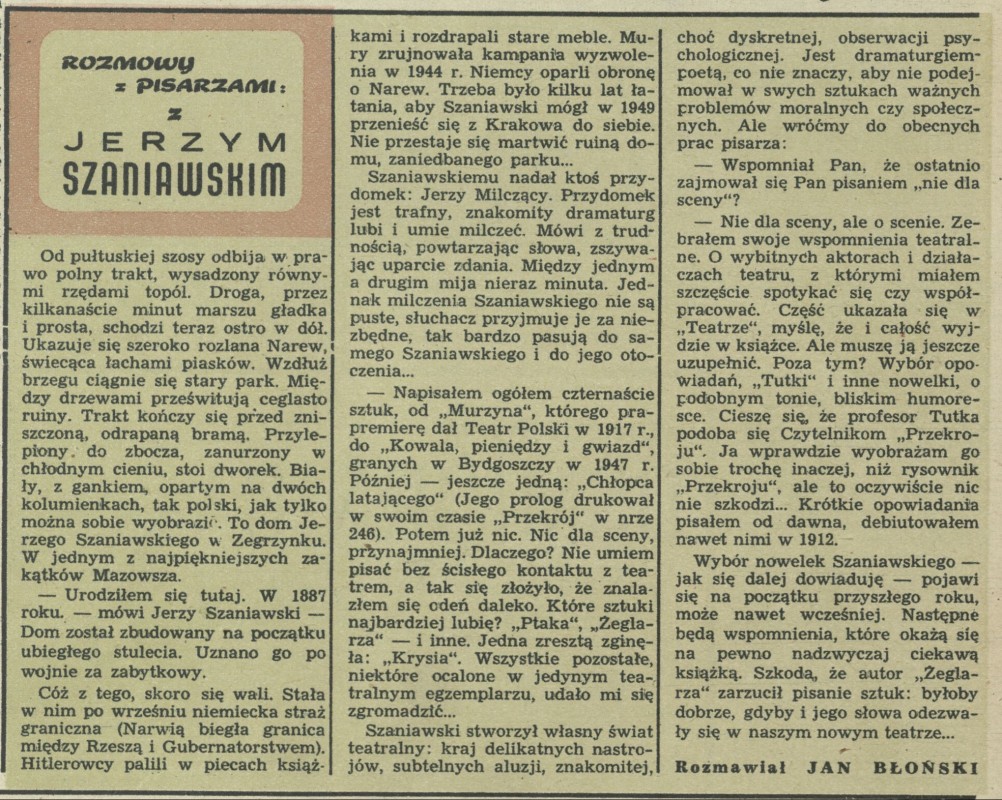 Archiwum / Rozmowy „Przekroju” nr 476 (21/1954) 04/15 Podziel się Tytuł Rozmowy z pisarzami: z Jerzym Szaniawskim Autor Jan Błoński Rubryka Rozmowy „Przekroju” Artykuł z numeru 476 (21/1954) Data wydania 23 maja 1954 Tagi literatura
