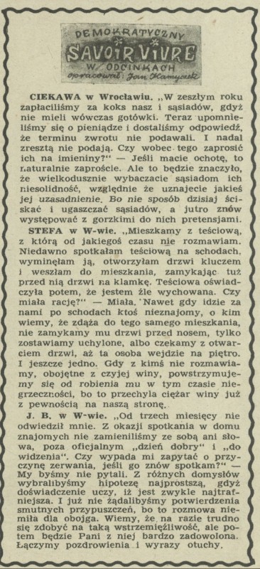 Archiwum / Demokratyczny savoir-vivre nr 476 (21/1954) 20/51 Podziel się Tytuł Demokratyczny savoir-vivre Autor Jan Kamyczek Rubryka Demokratyczny savoir-vivre Artykuł z numeru 476 (21/1954) Data wydania 23 maja 1954