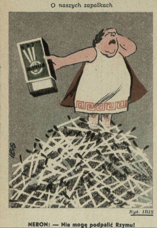 Archiwum / Rozmaitości [old] nr 476 (21/1954) 111/181 Podziel się Tytuł O naszych zapałkach Autor Ibis Rubryka Rozmaitości [old] Artykuł z numeru 476 (21/1954) Data wydania 23 maja 1954 Tagi propaganda karykatura satyra polityka Neron