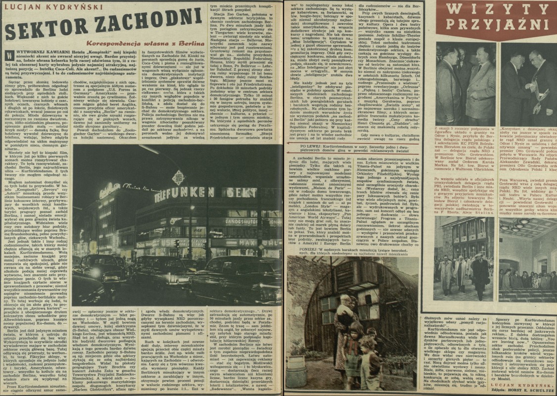 Archiwum / korespondencja własna "Przekroju" nr 536 (29/1955) 10/20 Podziel się Tytuł Sektor zachodni Autor Lucjan Kydryński Rubryka korespondencja własna "Przekroju" Artykuł z numeru 536 (29/1955) Data wydania 17 lipca 1955 Tagi Berlin NRD