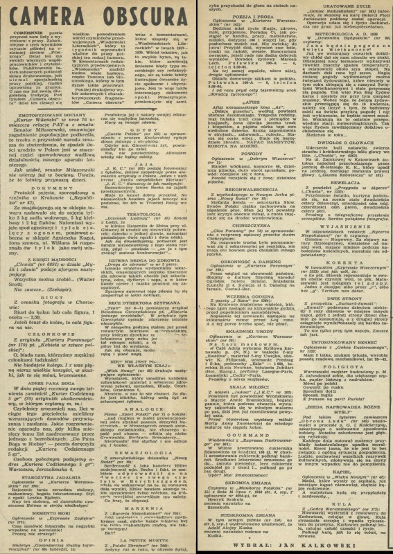 Archiwum / Różności nr 612 (01/1957) 58/3043 Podziel się Tytuł Camera obscura Autor Jan Kalkowski Kategoria Różności Artykuł z numeru 612 (1/1957) Data wydania 1 stycznia 1957 Tagi wycinki z prasy "Wiadomości literackie"