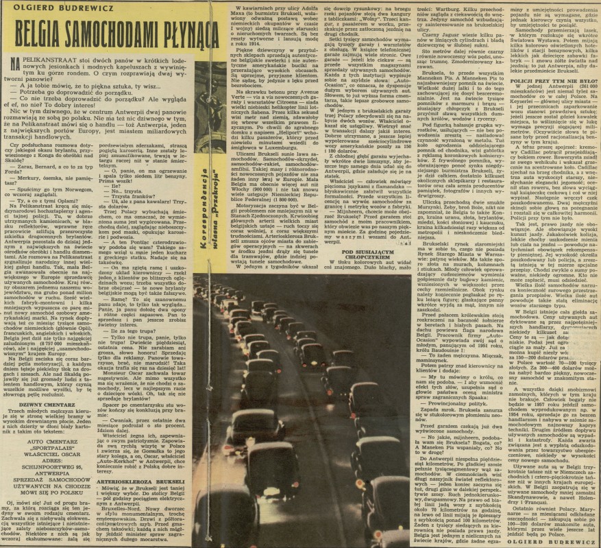 Archiwum / korespondencja własna "Przekroju" nr 612 (01/1957) 59/3043 Podziel się Tytuł Belgia samochodami płynąca Autor Olgierd Budrewicz Rubryka korespondencja własna "Przekroju" Artykuł z numeru 612 (1/1957) Data wydania 1 stycznia 1957