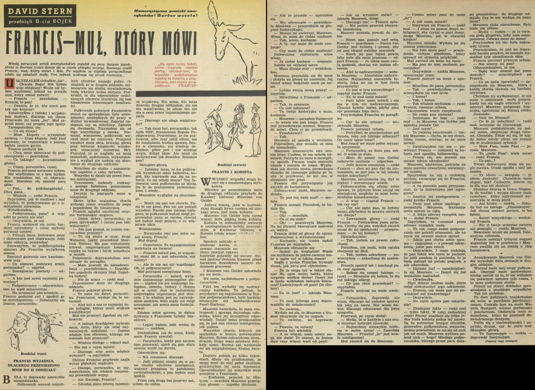 Archiwum / Proza nr 612 (01/1957) 73/3043 Podziel się Tytuł Francis-muł, który mówi Autor David Stern Bracia Rojek Kategoria Proza Artykuł z numeru 612 (1/1957) Data wydania 1 stycznia 1957 Tagi powieść amerykańska humoreska Gerret Price