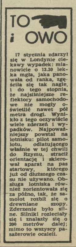 Archiwum / To i owo nr 515 (08/1955) 05/58 Podziel się Tytuł To i owo Rubryka To i owo Artykuł z numeru 515 (8/1955) Data wydania 20 lutego 1955 Tagi Londyn wypadek mgła