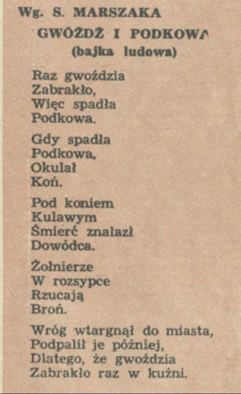Archiwum / Poezja nr 490 (35/1954) 62/188 Podziel się Tytuł Gwóźdż i podkowa Autor Samuił Marszak Kategoria Poezja Artykuł z numeru 490 (35/1954) Data wydania 29 sierpnia 1954 Tagi bajka ludowa