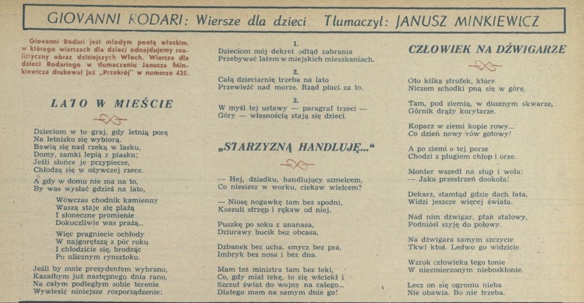 Archiwum / Poezja nr 428 (25/1953) 15310/123969 Podziel się Tytuł Giovanni Rodari: Wiersze dla dzieci Autor Janusz Minkiewicz Kategoria Poezja Artykuł z numeru 428 (25/1953) Data wydania 21 czerwca 1953 Tagi "Lato w mieście" "Starzyzną handluję..." "Człowiek na dźwigarze"