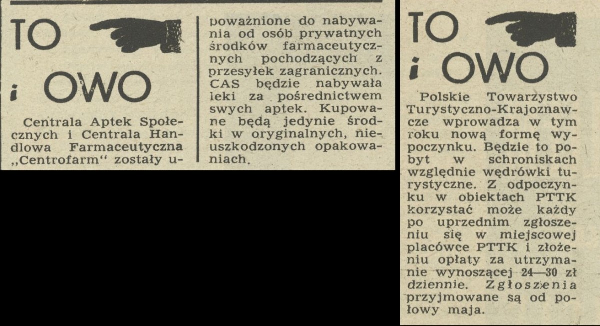 Archiwum / To i owo nr 371 (20/1952) 1/1 Podziel się Tytuł To i owo Rubryka To i owo Artykuł z numeru 371 (20/1952) Data wydania 18 maja 1952 Tagi apteka PTTK schronisko