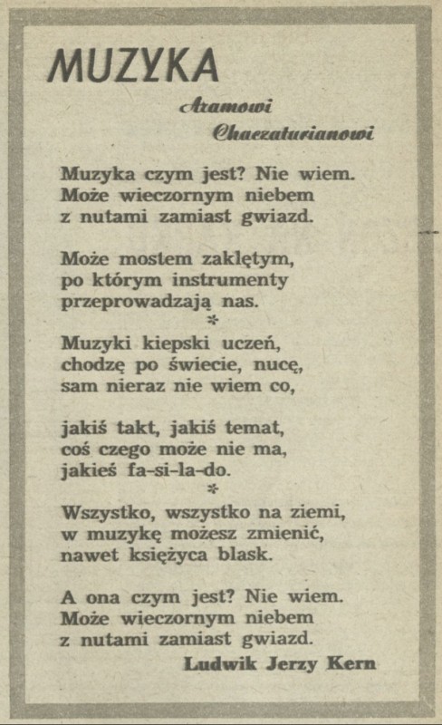 Archiwum / Poezja nr 396 (45/1952) 73/401 Podziel się Tytuł Muzyka Autor Ludwik Jerzy Kern Kategoria Poezja Artykuł z numeru 396 (45/1952) Data wydania 9 listopada 1952 Tagi wiersz