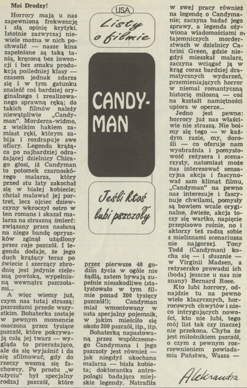 Archiwum / Listy o filmie nr 2494 (15/1993) 11/49 Podziel się Tytuł Candyman Autor Aleksandra Rubryka Listy o filmie Artykuł z numeru 2494 (15/1993) Data wydania 11 kwietnia 1993 Tagi horror Candyman