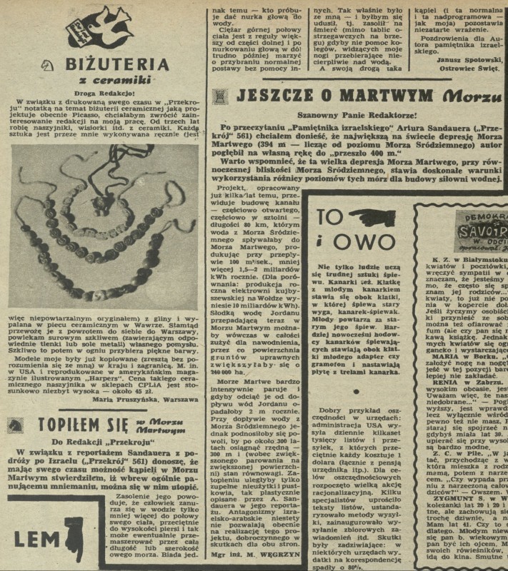 Archiwum / Listy do i od redakcji nr 564 (05/1956) 21667/123969 Podziel się Tytuł Listy do i od redakcji Rubryka Listy do i od redakcji Artykuł z numeru 564 (5/1956) Data wydania 29 stycznia 1956 Tagi Biżuteria z ceramiki Morze Martwe