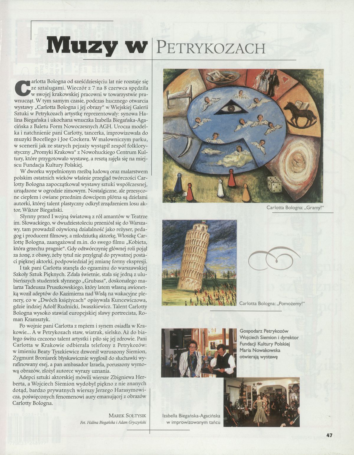 Archiwum / Kultura nr 2715 (27/1997) 08/12 Podziel się Tytuł Muzy w Petrykozach Autor Marek Sołtysik Kategoria Kultura Artykuł z numeru 2715 (27/1997) Data wydania 6 lipca 1997 Tagi Carlotta Bologna Fundacja Kultury Polskiej