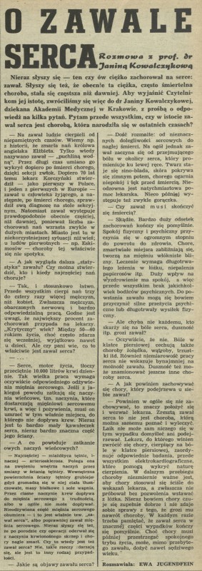 Archiwum / Wywiad nr 499 (44/1954) 163/210 Podziel się Tytuł O zawale serca Autor Ewa Jugendfein Kategoria Wywiad Artykuł z numeru 499 (44/1954) Data wydania 31 października 1954 Tagi zdrowie kardiologia medycyna Akademia Medyczna w Krakowie Kowalczykowa