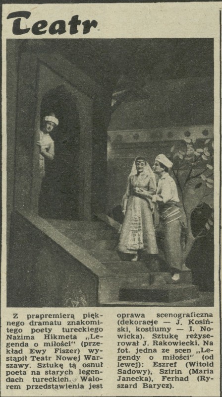 Archiwum / Teatr nr 498 (43/1954) 171/386 Podziel się Tytuł Teatr Rubryka Teatr Artykuł z numeru 498 (43/1954) Data wydania 24 października 1954 Tagi Hikmet "Legenda o miłości" Fiszer Teatr Nowej Warszawy Sadowy Janecka Barycz