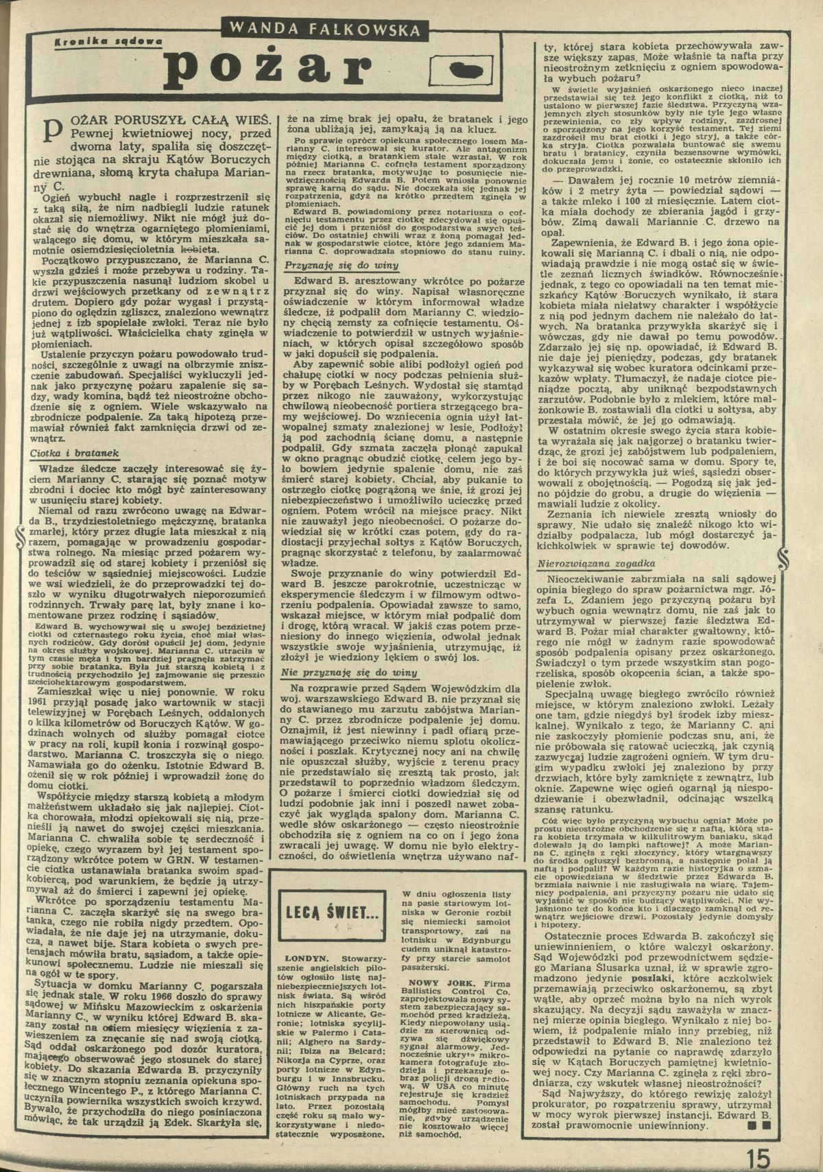 Archiwum / Kronika sądowa nr 1326 (36/1970) 562/881 Podziel się Tytuł Pożar Autor Wanda Falkowska Rubryka Kronika sądowa Artykuł z numeru 1326 (36/1970) Data wydania 6 września 1970
