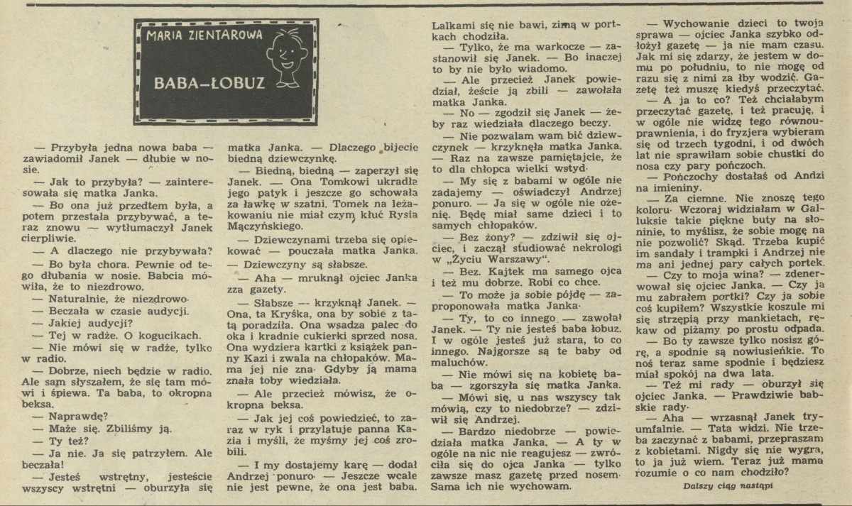 Archiwum / Felieton nr 526 (19/1955) 10/25 Podziel się Tytuł Baba-łobuz Autor Maria Zientarowa Kategoria Felieton Artykuł z numeru 526 (19/1955) Data wydania 8 maja 1955