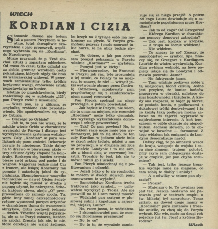 Archiwum / Felieton nr 580 (21/1956) 270/331 Podziel się Tytuł Kordian i cizia Autor Wiech Kategoria Felieton Artykuł z numeru 580 (21/1956) Data wydania 10 maja 1956 Tagi Teatr Narodowy Orbis