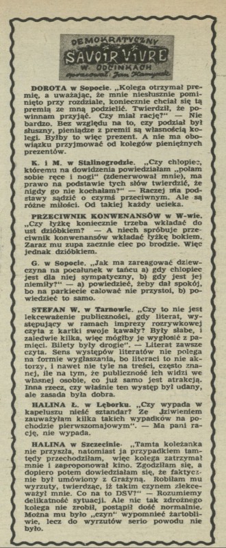 Archiwum / Demokratyczny savoir-vivre nr 580 (21/1956) 20/51 Podziel się Tytuł Demokratyczny savoir-vivre Autor Jan Kamyczek Rubryka Demokratyczny savoir-vivre Artykuł z numeru 580 (21/1956) Data wydania 10 maja 1956 Tagi obyczaje kultura