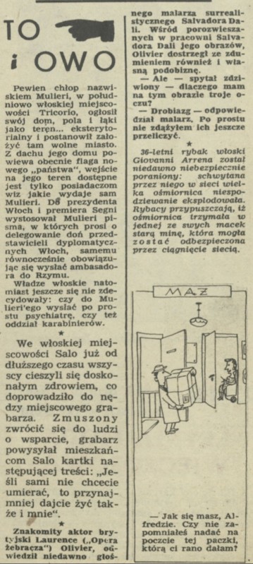 Archiwum / To i owo nr 581 (22/1956) 10/45 Podziel się Tytuł To i owo Rubryka To i owo Artykuł z numeru 581 (22/1956) Data wydania 27 maja 1956 Tagi Mulieri Tricorio Włochy Salo Laurence Olivier rybak