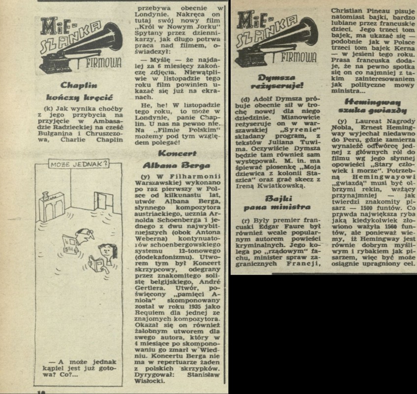 Archiwum / Mieszanka firmowa nr 580 (21/1956) 22408/123969 Podziel się Tytuł Mieszanka firmowa Rubryka Mieszanka firmowa Artykuł z numeru 580 (21/1956) Data wydania 10 maja 1956 Tagi Chaplin koncert Alban Berg Dymsza Faure Hemingway