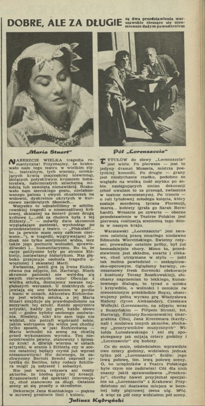 Archiwum / Teatr nr 550 (43/1955) 96/185 Podziel się Tytuł Dobre, ale za długie Autor Juliusz Kydryński Edward Hartwig Rubryka Teatr Artykuł z numeru 550 (43/1955) Data wydania 23 października 1955 Tagi Eichlerówna "Maria Stuart" "Lorenzaccia" Wierciński